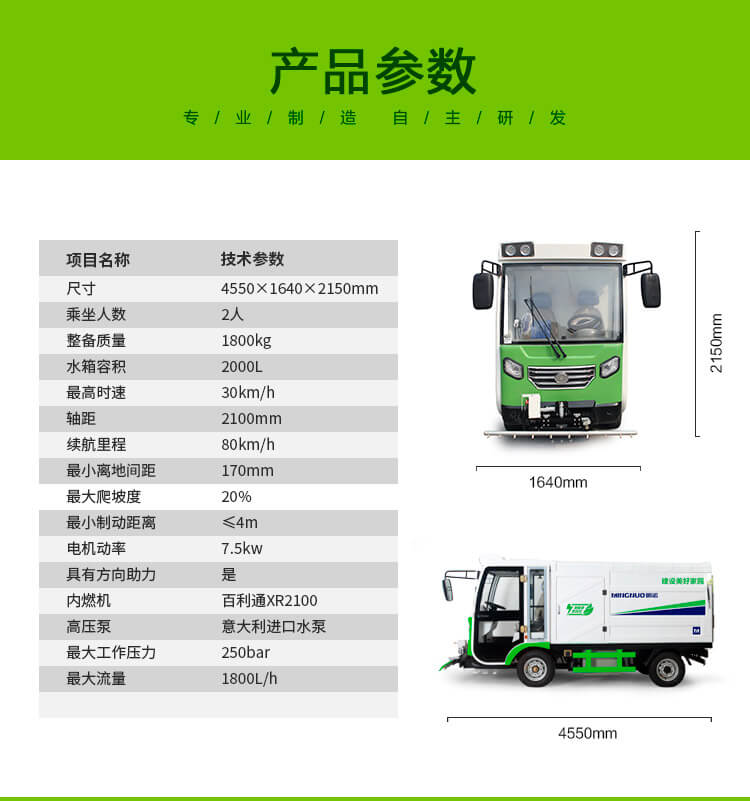 該車配備前置沖洗裝置和可移動噴水槍,可用于路面養護、地面清潔、植被清潔澆灌、建筑物雕像清潔等,也可用于消毒和噴灑農藥。適用于路面養護、沖洗路邊攤地面油污和清除城市中“牛皮癬”、 小廣告、道板、護欄、路崖的死角等部位。